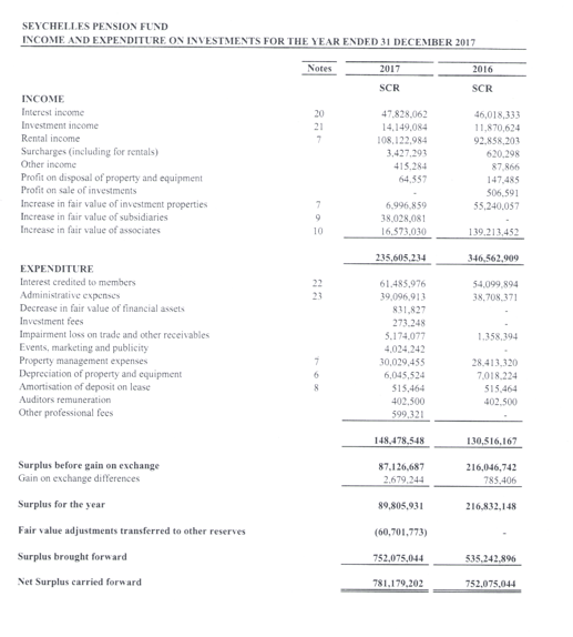 E. Default cases of Employers 194 assessments cases of employers in default of contributions detected and amount recovered was SCR 2.5 m Surcharges levied was SCR 3.2 m. _______________________ F. Investments Investment income: SCR170 m (13% increase from SCR 151 m in 2016) Other income (surcharges): SCR 4m (SCR 1m in 2016) Total expenditure for investments and administration: SCR 136 m (SCR 123 m in 2016) Excess Income over Expenditure: SCR 38 m (SCR 29m in 2016) Rate of return for 2017 was 8% (9% in 2016) Investment income represented 39% of total revenue of SPF (35% in 2016) _______________________ G. Properties 25 properties on Mahé, Praslin/La Digue 3 are yet to be developed Rental Income of SCR 108 m (SCR 93 m in 2016) Property maintenance expenses: SCR 30 m (SCR 28 m in 2016) Net profit from rentals SCR 78 m (SCR 65m in 2016) Average occupancy rate of all SPF properties for the year is 92% (96% in 2016) Real Estate worth SCR1.5 billion |