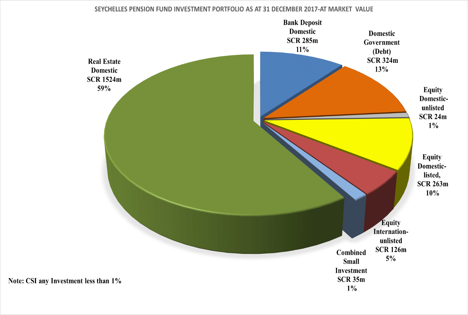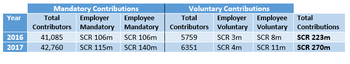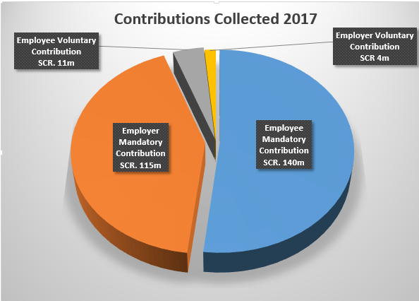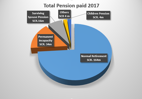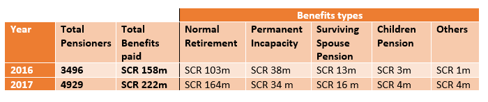 A. Total Net Assets SCR 2.8 billion (2017) SCR 2.6 billion (2016) _____________________ B. Membership Active Members: 42,760 (84% coverage of working population – 50,606) Total Employers registered with SPF:3,068 New Employers in 2017: 310 (5% from 296 in 2016) Total self-employed registered with SPF: 1,653 New Self Employed in 2017: 285 (26% from 213 in 2016) Total Members’ Funds in 2017: SCR1.4 b (10% increase from 2016) _______________________ C. Contributions Mandatory Contributions: SCR255 m – received from 42,760 contributors (4% increase from 41,085 in 2016) Voluntary Contributions: SCR15 m – received from 6,351 contributors (9% increase from 5,759 in 2016 ) Total Contributions: SCR270 m _______________________ D. Pension and Benefits Total Pension and Benefits: SCR 222 m – paid to 4,929 beneficiaries (29% increase from 3,496 in 2016) Normal Retirement pension: SCR164 m – paid to 3,765 beneficiaries Permanent Incapacity pension: SCR34 m- paid to 632 beneficiaries Spouse Pension: SCR 16 m – paid to 381 beneficiaries Children Pension: SCR 4 m – paid to 151 beneficiaries Others: SCR 4 m -240 refunds Excess contributions over pension and benefits payments : SCR 48 m (SCR 65m in 2016) |