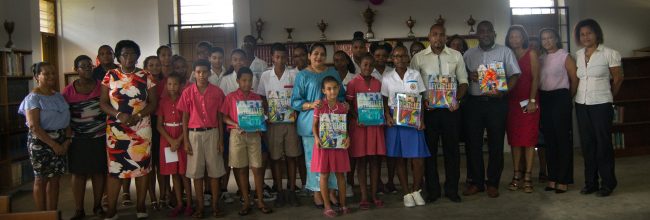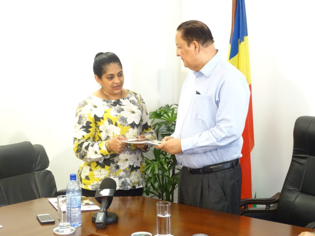 “The CEO Seychelles Pension Fund, Mrs Lekha Nair presents a copy of the book “ Art in Seychelles, Then and Now” to Mr. Jean Alcindor, DG for Education and Student Support Services (DG ESSS) of the Ministry of Education and Human Resource Development in a ceremony at the Mont Fleuri Secondary School this morning.…